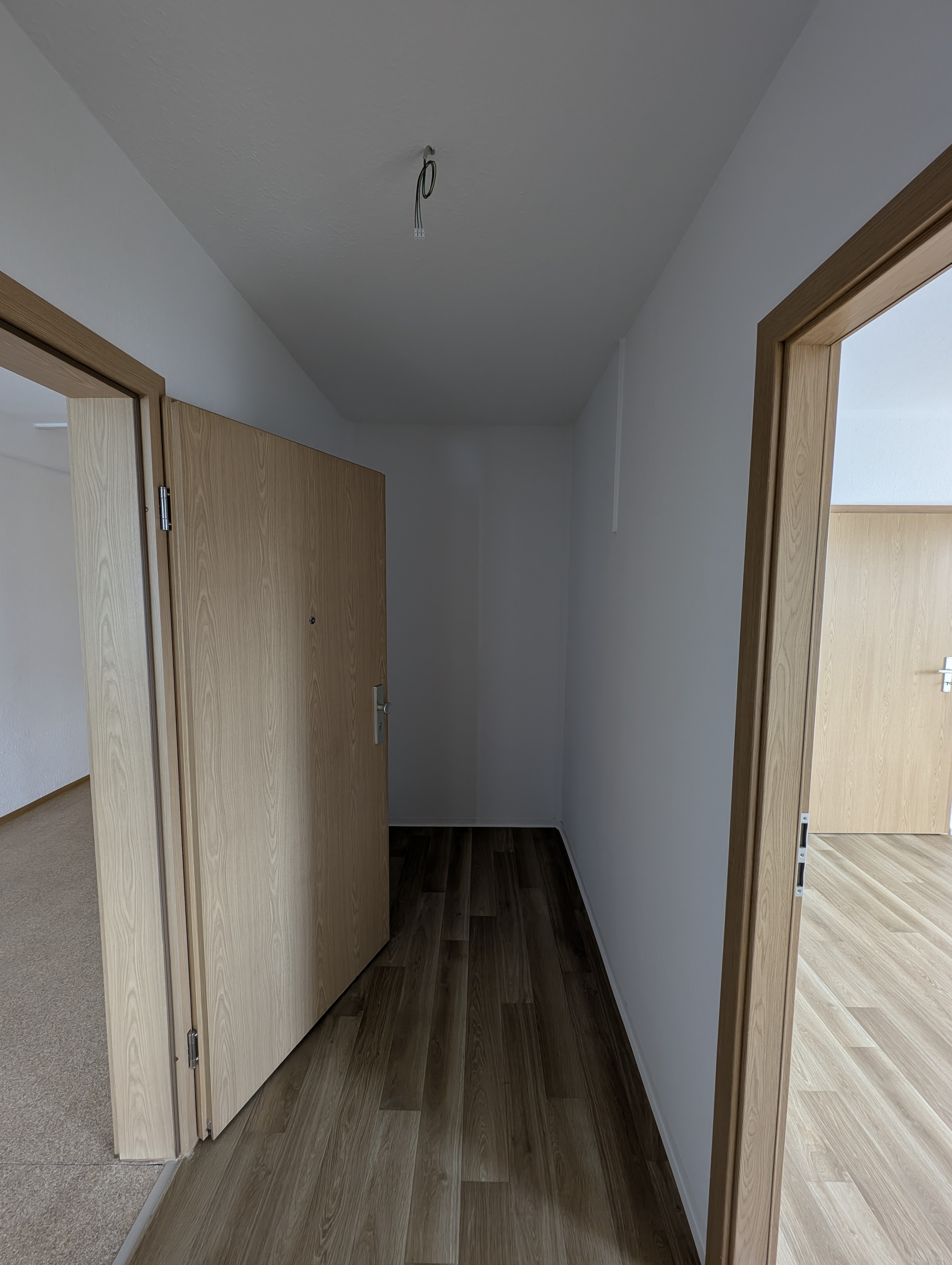Wohnung wird komplett renoviert und ist ebenerdig; Raufasertapete weiß; PVC – Fußbodenbelag