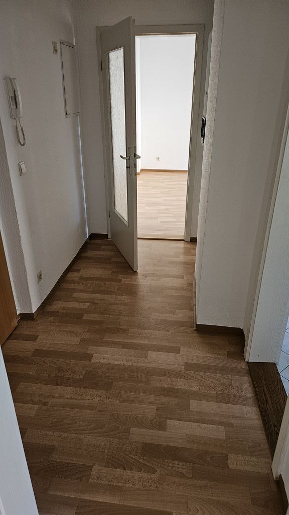 Wohnung wird komplett renoviert; Raufasertapete weiß; neuer PVC – Fußbodenbelag