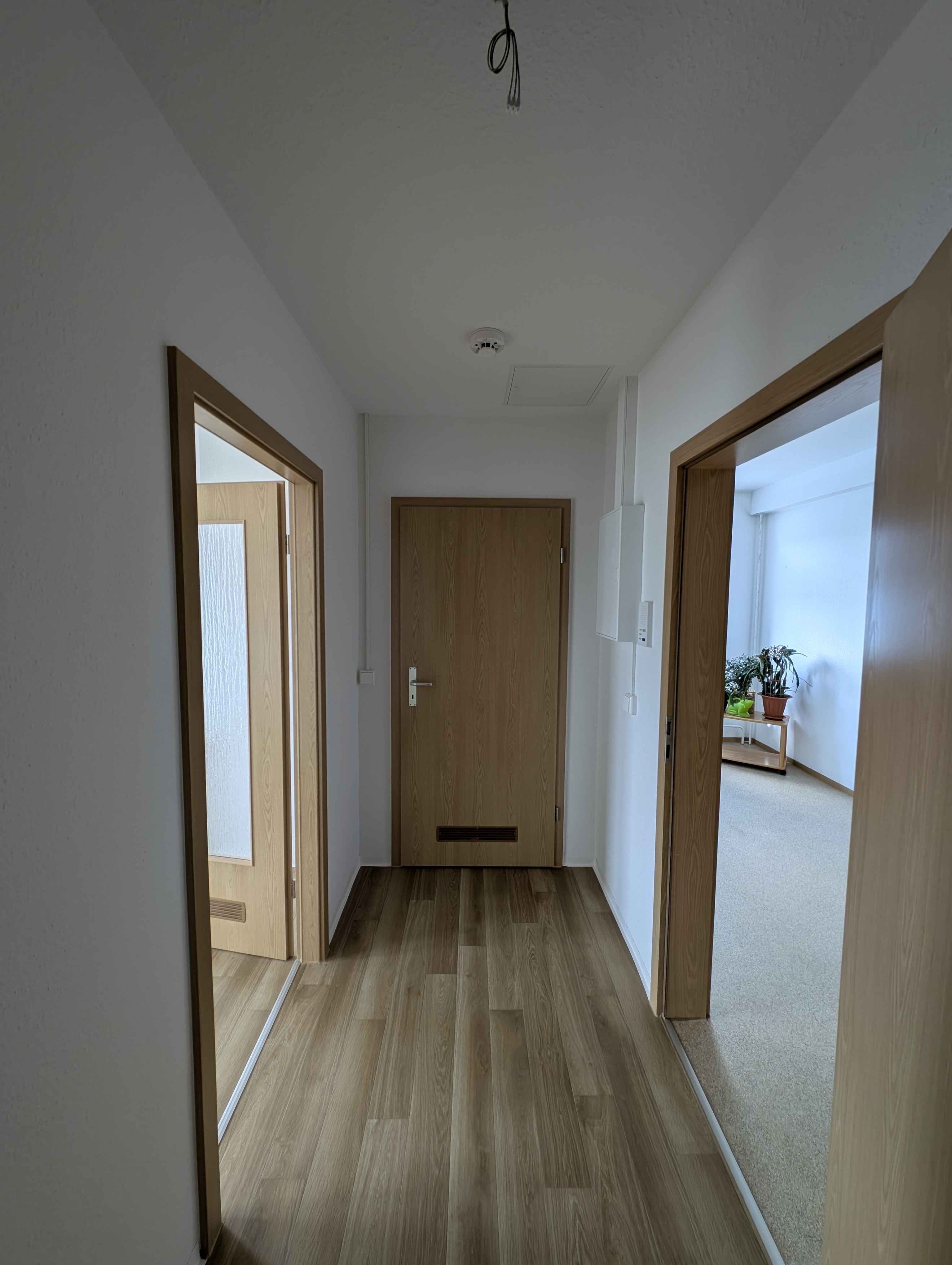 Wohnung wird komplett renoviert und ist ebenerdig; Raufasertapete weiß; PVC – Fußbodenbelag