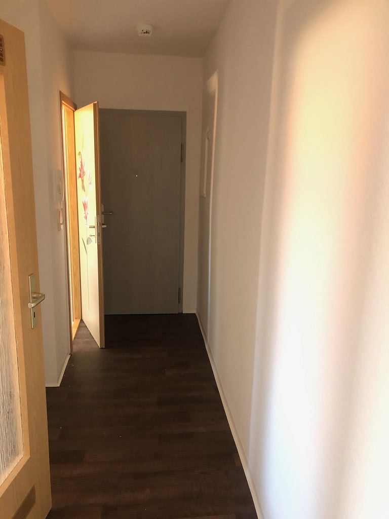 Wohnung ist komplett renoviert; Raufasertapete weiß; PVC – Fußbodenbelag
